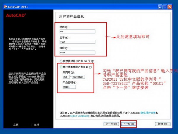 用戶信息自己所以填寫即可 勾選“我已擁有我的產(chǎn)品信息” 輸入CAD2011 32位中文版的序列號(hào)“356-72378422”產(chǎn)品密匙“001C1” 點(diǎn)擊“下一步”按鈕繼續(xù)安裝 如圖六。