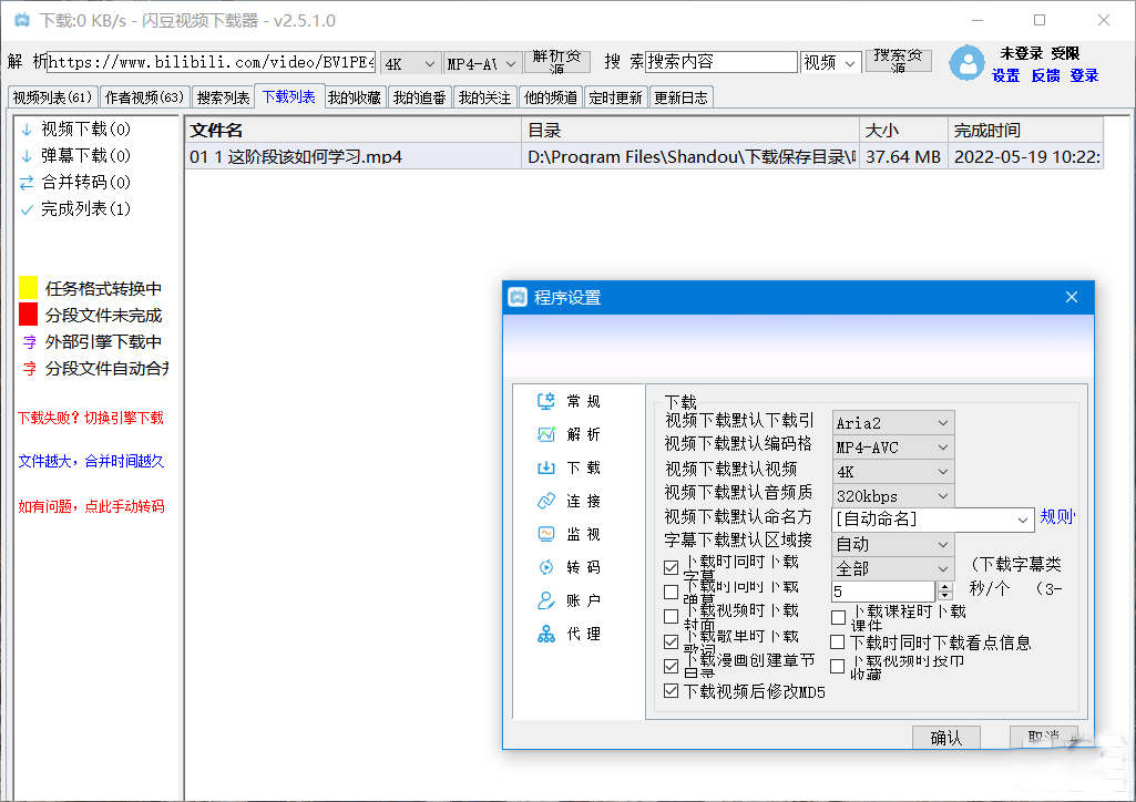 而且支持轉(zhuǎn)碼自動合并,登錄網(wǎng)站賬號,解析下載會員視頻,例如B站還能同步賬號信息,一鍵批量下載關注的視頻,收藏列表,番劇等等