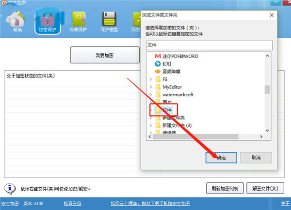 3、點擊我要加密之后就會出現(xiàn)一個選擇文件的界面,在這個界面中我們選中想要加密的文件或者文件夾并點擊確定按鈕。