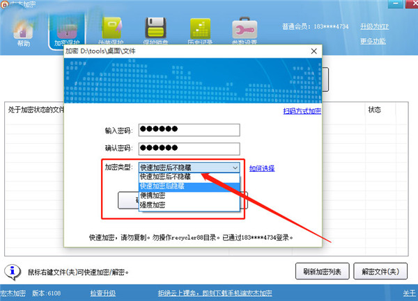 5、設(shè)置好加密文件的密碼之后下一步可以選擇加密類型,有加密并隱藏、便捷加密、強(qiáng)度加密等多個選項,用戶根據(jù)自己的需求選擇即可。