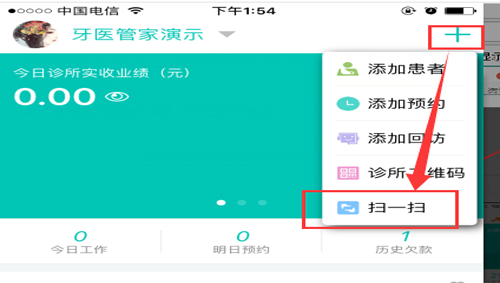 4、打開手機牙醫(yī)管家,點擊右上角的“+”選擇“掃一掃”,即可關(guān)聯(lián)手機端。