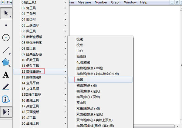 步驟一:選擇橢圓工具。打開幾何畫板,單擊左邊工具欄的“自定義工具”按鈕,在其工具菜單選擇“圓錐曲線A”——“橢圓”工具,如下圖所示。
