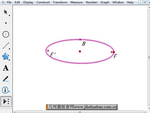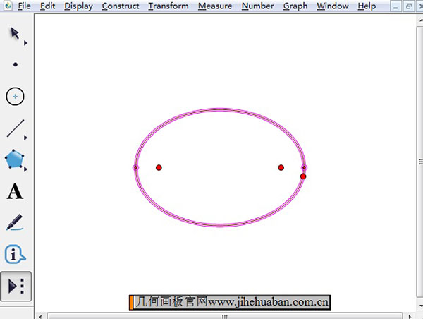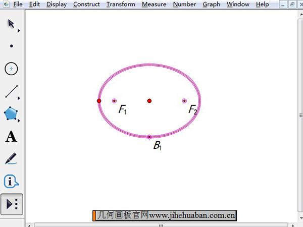 步驟如下:單擊左邊工具欄的“自定義工具”按鈕,在其工具菜單選擇“圓錐曲線A”——“橢圓(焦點+點)”工具,在右側的空白位置單擊鼠標兩下確定左右焦點的位置,然后拖動鼠標確定橢圓形狀即可,繪制的橢圓如下圖所示。