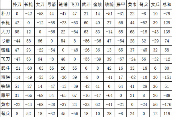 平克凹、凹克尖、尖克平具體看圖(在第一列找到敵方兵種,在本行查找負(fù)數(shù)即為我方可知敵人,負(fù)數(shù)絕對(duì)值越大克制越強(qiáng)):