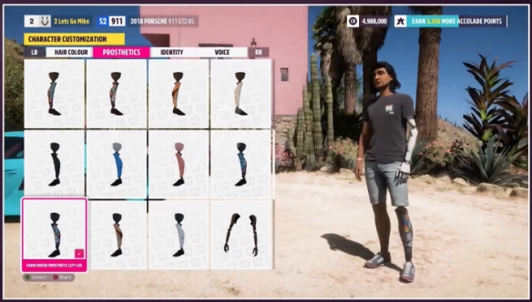 在極限競速地平線5中,玩家在創(chuàng)建角色的過程中可以選擇義肢,雙臂和雙腿共有33種義肢可供玩家選擇。游戲中獲得的裝飾品同樣可以在義肢上使用,此舉意在讓殘疾玩家也可在游戲中創(chuàng)造出更符合自己實際的角色形象。