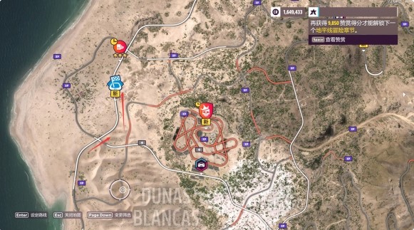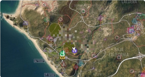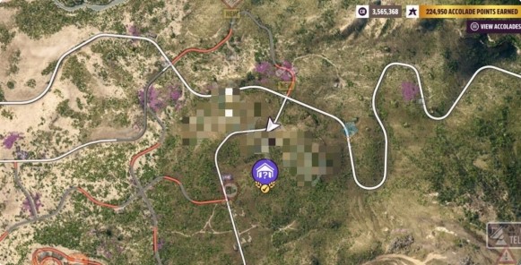 在地圖頂部的公路附近。下方地圖中央還是越野賽事的舉辦地點(diǎn),旁邊就是車庫(kù)寶物。車庫(kù)入口處有一輛摩托車。