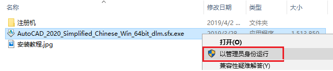 1、先使用“百度網(wǎng)盤客戶端”下載CAD_2020軟件安裝包(含注冊機)到電腦磁盤里,并解壓縮,安裝前先斷開電腦網(wǎng)絡(luò),然后在文件夾內(nèi)找到AutoCAD_2020_Simplified_Chinese_Win_64bit_dlm.sfx.exe,鼠標右擊選擇【以管理員身份運行】,如六藍分享的截圖: