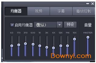 4、播放菜單旁邊,就是一個控制面板,這里有整個軟件的設(shè)置參數(shù),均衡器,視頻,字母,播放控制。均衡器這里有很多現(xiàn)成的模板,比如流行音樂,電影,新聞,當然也可以自定設(shè)置成小波浪,記得要打勾啟用先。