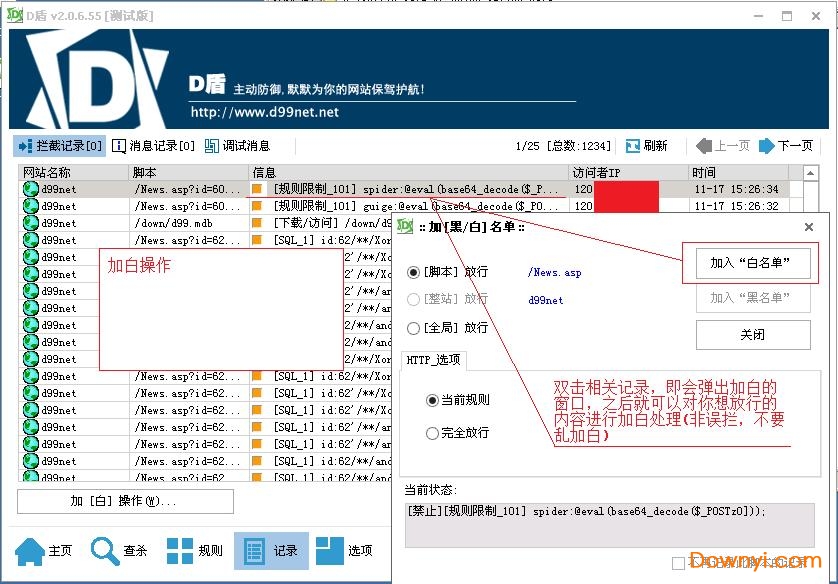 2.誤攔的處理當有誤攔時,請到d盾的"記錄"里查看,雙擊誤攔記錄,會彈出加白的窗口,之后點擊 [加入“白名單”]即可放行。