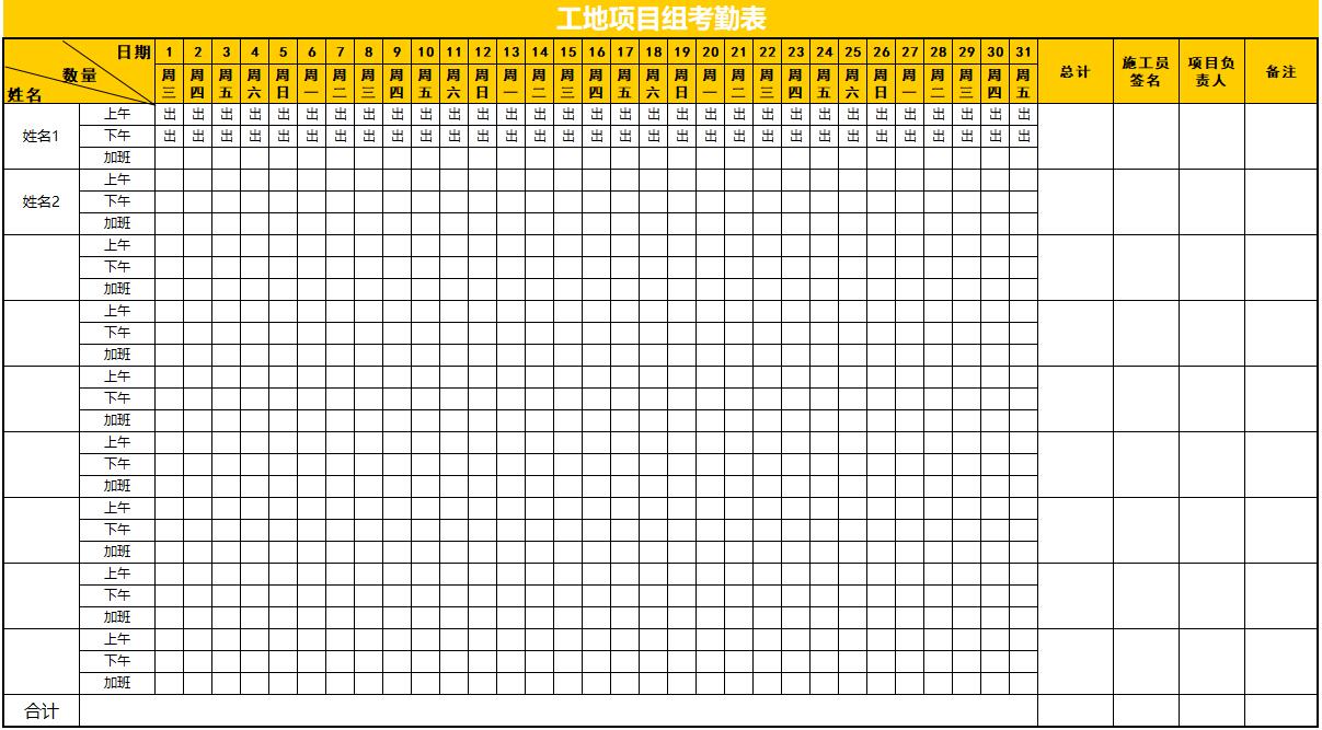 1. 項(xiàng)目名稱和工地地址:記錄施工項(xiàng)目的名稱和具體位置信息。2. 日期和星期:列出每天的日期和對(duì)應(yīng)的星期,方便對(duì)出勤情況進(jìn)行統(tǒng)計(jì)和分析。