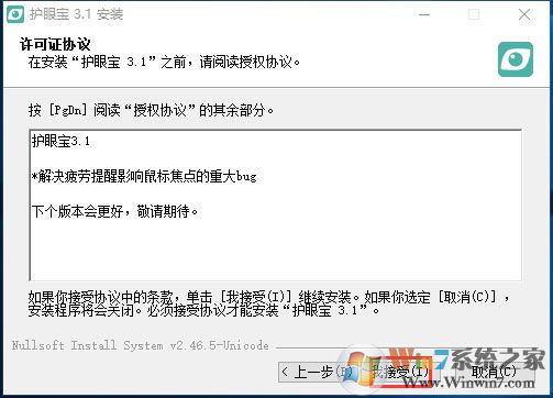 1、在winwin7網(wǎng)站下載護眼寶軟件,解壓后雙擊.exe,進入護眼寶安裝許可證協(xié)議界面,點擊“我接受”可繼續(xù)安裝;