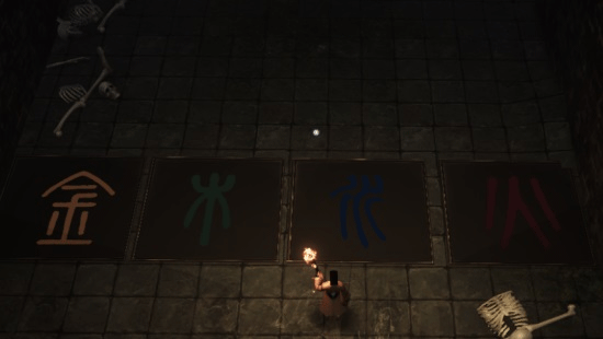 接下來(lái)來(lái)到右邊的解密密室,這里的解密同樣很簡(jiǎn)單,按出金木水火土的順序就可以。
