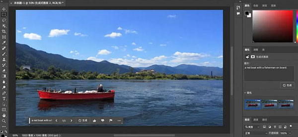 3、天上有些空?只需在天上掛一個熱氣球、幾只飛鳥。三句話,讓 Photoshop 幫我畫一幅春江垂釣風(fēng)景圖。