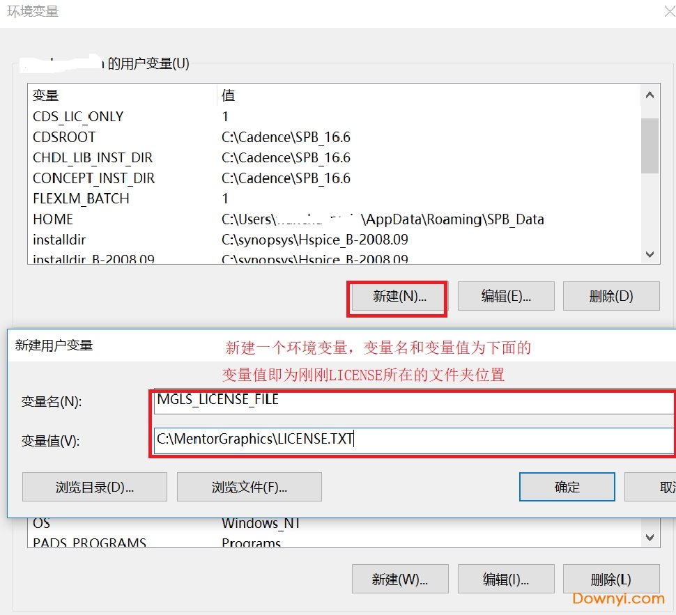 7、點擊新建,然后添加變量名為MGLS_LICENSE_FILE,變量值為C:\MentorGraphics\LICENSE.TXT(剛剛保存的LICENSE文件的位置)。
