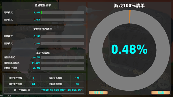 3、游戲UI也很精美,作者還特意增加了一個(gè)游戲清單,里面列出了所有玩家玩過的關(guān)卡,玩家闖關(guān)的失敗次數(shù),僵尸死亡次數(shù)等都被列出來了,可以說是記錄了所有玩家想要知道的信息。
