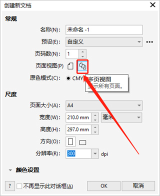 ①運(yùn)行軟件,點(diǎn)擊創(chuàng)建新文檔。在彈出的窗口中,輸入文檔名,頁(yè)面視圖選擇多頁(yè)視圖,設(shè)置好文檔的其他參數(shù),點(diǎn)擊OK進(jìn)行創(chuàng)建。