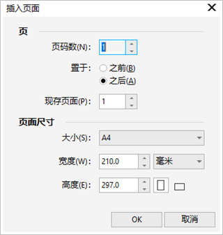 ④點(diǎn)擊插入頁(yè)面,會(huì)彈出對(duì)話框,在對(duì)話框中可以設(shè)置頁(yè)碼、頁(yè)面尺寸以及頁(yè)面方向,點(diǎn)擊OK就可以插入一個(gè)頁(yè)面。