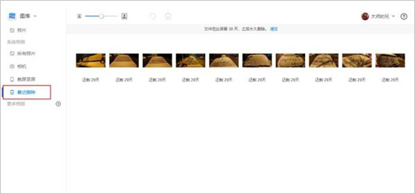 刪除之后,會(huì)發(fā)現(xiàn)云空間占用數(shù)據(jù)依然沒(méi)有變化,那是因?yàn)閯h除后的照片到了最近刪除,依然占用空間,最后把這里的清空就可以啦;