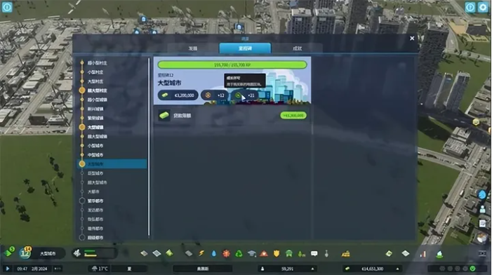 對于沒有游戲目標(biāo)就容易陷入迷茫狀態(tài)的玩家,”里程碑“系統(tǒng)可以幫助制定目標(biāo)。該系統(tǒng)將玩家的游戲進(jìn)程分為從超小型村莊到超級都市的20個檔位。隨著城市人口上漲,城市規(guī)模就會逐步提升。城市規(guī)模提升后,系統(tǒng)會贈送給玩家一大筆資金,以及“成長許可”和“發(fā)展點數(shù)”。