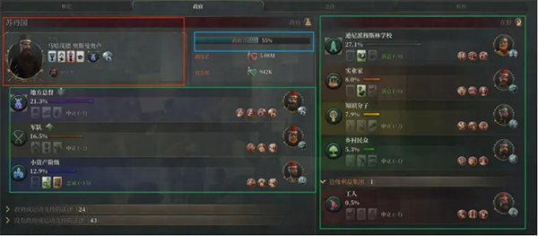 打開(kāi)政治界面,里面是國(guó)家的政府以及各個(gè)利益團(tuán)體,還可以在此指定法律和設(shè)立機(jī)構(gòu)