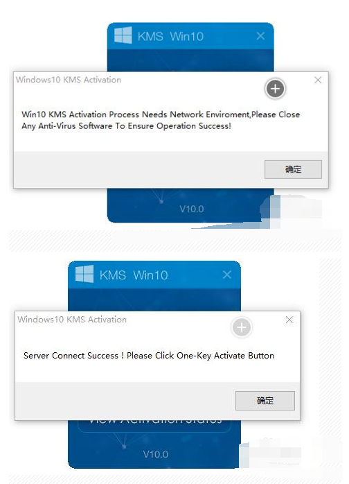 2.此時如果電腦正常聯(lián)網(wǎng),同時沒有相關(guān)殺毒軟件的攔截時,則彈出如圖所示的“Win10 KMS激活”窗口,提示“已成功連接到服務(wù)器,請點擊“一鍵激活按鈕”。點擊“確定”按鈕。
