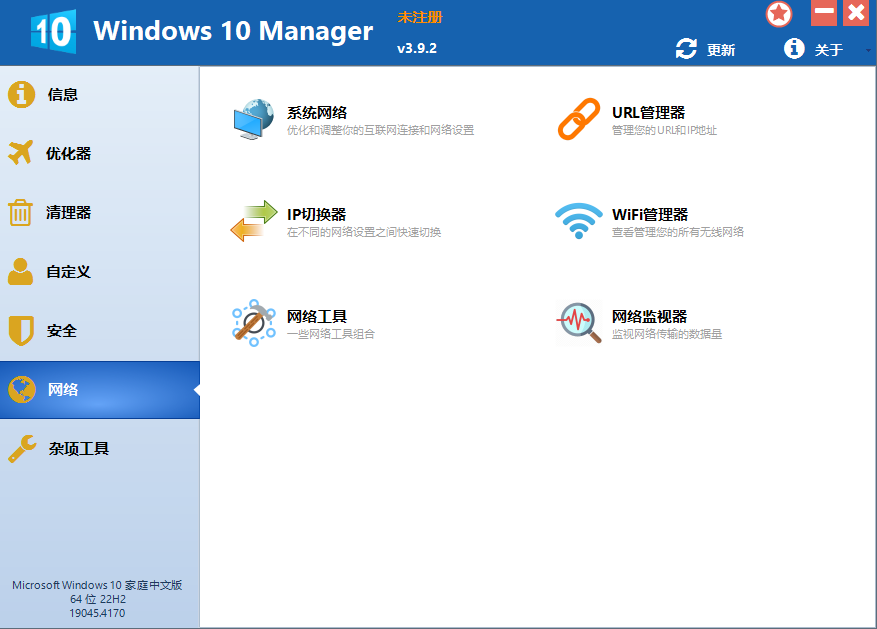 2、 優(yōu)化和調(diào)整你的互聯(lián)網(wǎng)連接和網(wǎng)絡(luò)設(shè)置;調(diào)整微軟Edge瀏覽器設(shè)置;IP切換器可以在不同的網(wǎng)絡(luò)設(shè)置之間輕松切換;編輯hosts文件以加快系統(tǒng)瀏覽互聯(lián)網(wǎng)的速度; Wi-Fi管理可以查看和管理所有的無線網(wǎng)絡(luò)。