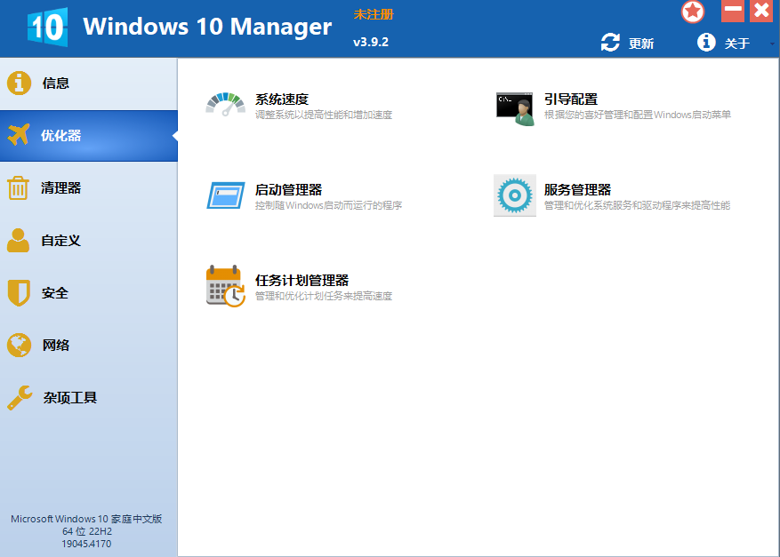Manager是一款專業(yè)用于微軟Windows10和11的優(yōu)化工具,Manager包含了40多個不同的實用功能來優(yōu)化,調(diào)整,清理,加速修復(fù)Windows系統(tǒng),可以讓電腦的系統(tǒng)運營速度更快,消除系統(tǒng)故障,提高穩(wěn)定性和安全性,Manager非常實用,個性化Windows10滿足您對系統(tǒng)優(yōu)化調(diào)整的所有要求。不論你是想提升系統(tǒng)性能,還是解決系統(tǒng)問題,這款Manager都能滿足你的需求。