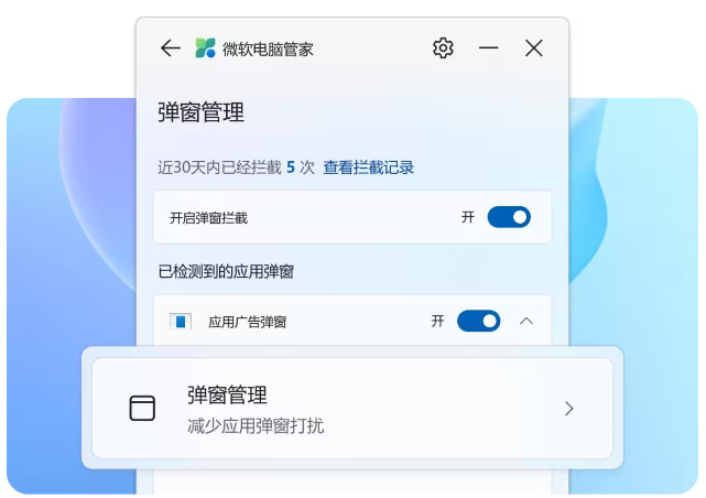 開(kāi)啟彈窗管理功能,減少?gòu)V告及應(yīng)用彈窗,使你的電腦純凈無(wú)擾。