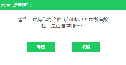 點擊“開始制作”,這時會出現(xiàn)一個彈窗警告如下圖,如果U盤中有重要資料需要先備份,點擊確定開始制作所有數(shù)據(jù)都會被格式化刪除。