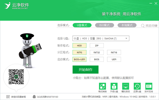 第二步:使用云凈U盤啟動工具制作啟動u盤打開云凈u盤啟動盤制作工具,將準(zhǔn)備好的u盤插入電腦usb接口,等待軟件自動識別所插入的u盤。使用默認(rèn)參數(shù)即可制作出兼容所有電腦的U盤工具了。