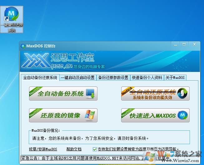 4、完成安裝,啟動桌面上的一鍵備份還原即可啟動maxdos控制臺,同時系統(tǒng)重啟后可以選擇在maxdos中操作。