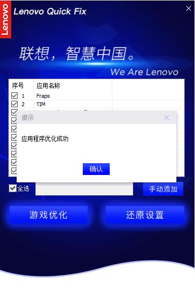 點(diǎn)擊“游戲優(yōu)化”則可以對(duì)已選的應(yīng)用進(jìn)行加速優(yōu)化,優(yōu)化成功后提示,如圖7: