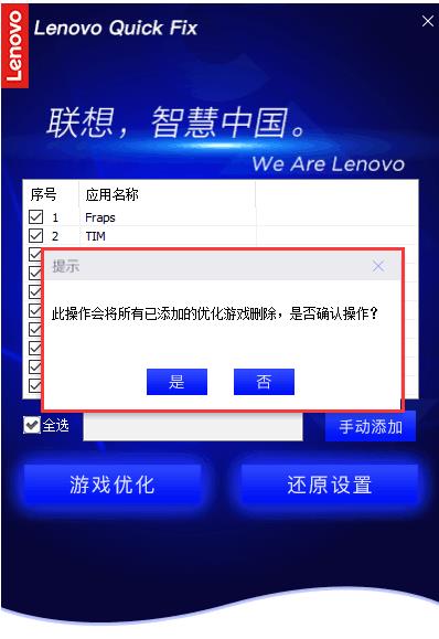 點(diǎn)擊“是”則會(huì)刪除所有已添加的優(yōu)化游戲,點(diǎn)擊“否”則返回游戲設(shè)置頁(yè)面。