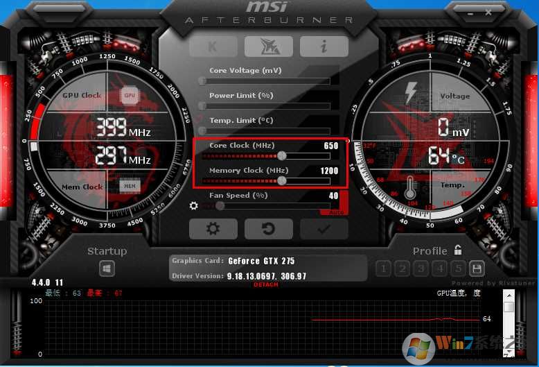 下載安裝完后。打開MSI超頻工具。如圖所示。默認(rèn)開放的權(quán)限是核心頻率和顯存頻率,我們只要拖動滑塊,然后點擊勾就應(yīng)用就可以超頻了。圓圈是回復(fù)默認(rèn)。