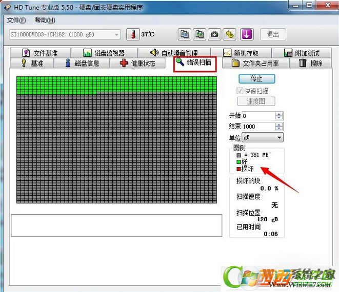 2、錯誤掃描就是掃硬盤有沒有壞道,如果硬盤上有壞道會導(dǎo)致系統(tǒng)卡頓死機這一類的現(xiàn)象。如果有在HD Tune表現(xiàn)就是顯示示紅色的小方塊。正常會顯示示綠色的方塊