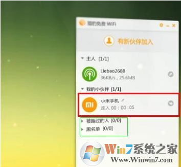 5、設(shè)置好電腦后,打開手機wifi搜索,找到自己設(shè)置的名字,然后輸入密碼連接,電腦會提示連接成功,有小伙伴加入,也可以管理加入的人員拉黑,踢出等,防止蹭網(wǎng)