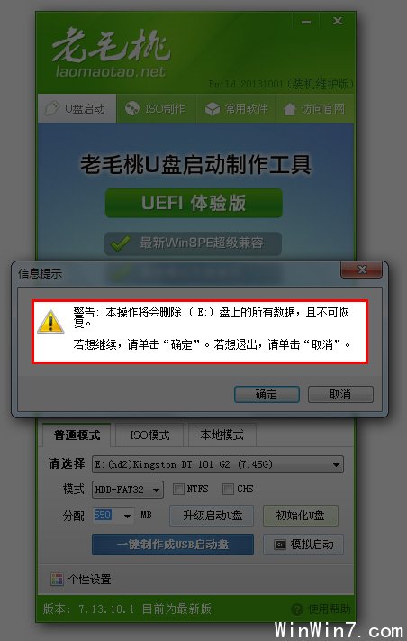 按鈕,程序會提示是否繼續(xù),確認所選U盤無重要數(shù)據(jù)后開始制作: